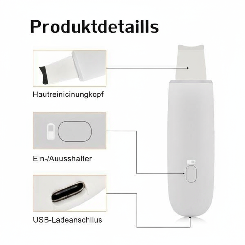 Ultraschall: Mithilfe des Ultraschall-Prinzips dringt das Gerät in die Oberhaut (Epidermis) ein, entfernt oberflächlichen Talg und Schmutz und löst Ablagerungen zur gründlichen Reinigung.